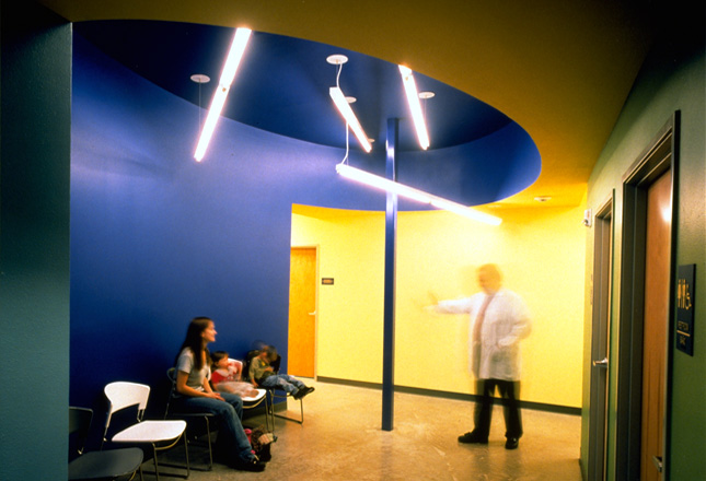 From the central reception, patients are called to smaller waiting areas and clusters of private consultation rooms are carved out along circulation paths using vibrant colors, spaces of varying shape, and bare fluorescent fixture arrays. The building relies on simple, inexpensively constructed, shed forms. Rather than a single volume, the form was broken up in order to provide natural light in every space related to patient functions.